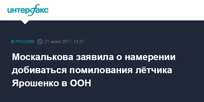 Москва. 21 июля. INTERFAX.RU - Уполномоченный по правам человека в РФ Татьяна Москалькова намерена добиться помилования российского лётчика Константина Ярошенко, отбывающего 20-летний срок заключения в США, и будет обращаться по этому поводу в ООН.