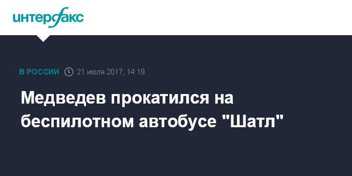 Москва. 21 июля. INTERFAX.RU - Глава российского правительства Дмитрий Медведев в пятницу ознакомился с проектом группы "КАМАЗ" и научно-исследовательского автомобильного и автомоторного института (ФГУП "НАМИ") - беспилотным автобусом "Шатл" - и прокатился на нем.