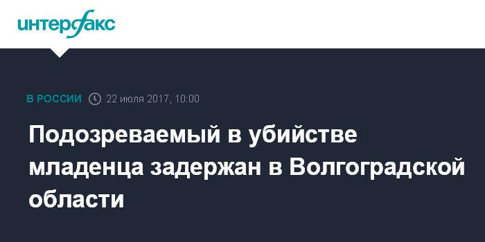 Москва. 22 июля. INTERFAX.RU - Уголовное дело по факту убийства младенца возбудили следователи в Волгоградской области, подозреваемый задержан, сообщила в субботу агентству "Интерфакс" официальный представитель регионального следственного управления СКР Наталия Куницкая.