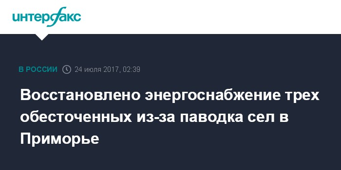 Москва. 24 июля. INTERFAX.RU - Ремонтные бригады восстановили энергоснабжение трех сел в Приморье, нарушенное в воскресенье утром из-за паводка, сообщила пресс-служба администрации края.