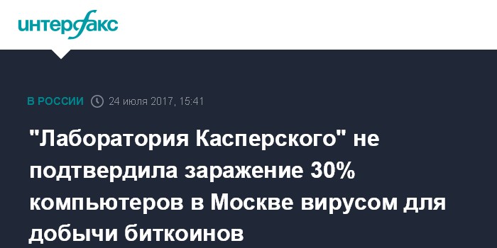 Ранее советник президента РФ по развитию интернета Герман Клименко сообщил в интервью RNS, что от 20% до 30% компьютеров в Москве заражены вирусом для добычи биткоинов.