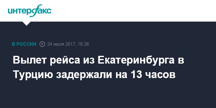 Москва. 24 июля. INTERFAX.RU - Рейс авиакомпании Onur Air Екатеринбург-Анталья (Турция) был задержан в аэропорту "Кольцово" на 13 часов с лишним, свидетельствуют данные он-лайн табло аэропорта.