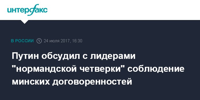 Москва. 24 июля. INTERFAX.RU - Президент РФ Владимир Путин во время телефонного разговора лидеров "нормандской четверки" изложил российские подходы к минским договоренностям, сообщили в понедельник в пресс-службе Кремля.