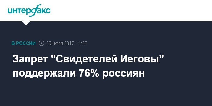 Москва. 25 июля. INTERFAX.RU - К "Свидетелям Иеговы" россияне относятся преимущественно негативно или нейтрально, а решение о запрете их деятельности в России поддерживает 76% опрошенных, сообщает ВЦИОМ со ссылкой на данные всероссийского телефонного опроса, проведенного 20-21 июля среди 1200 респондентов.