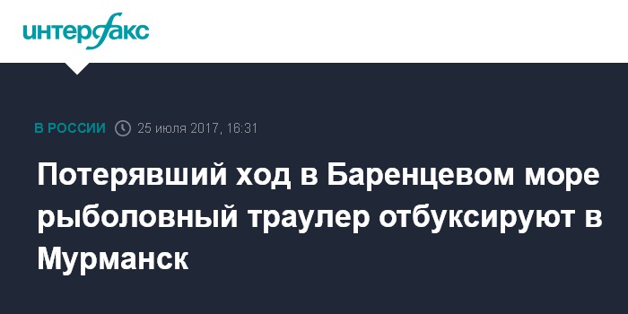 Москва. 25 июля. INTERFAX.RU - Спасательное судно приступило к буксировке в порт Мурманск рыболовного траулера "Себекс", потерявшего ход в Баренцевом море.