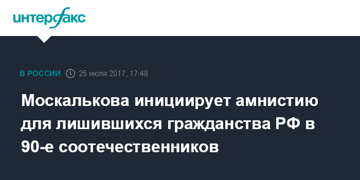Москва. 25 июля. INTERFAX.RU - Уполномоченный по правам человека в РФ Татьяна Москалькова выступила за упрощенный порядок восстановления гражданства России для тех, кто получил его в 90-х и лишился из-за ошибок при получении.
