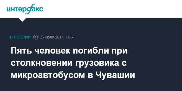 Москва. 26 июля. INTERFAX.RU - По предварительным данным, пять человек погибли, еще четверо пострадали в результате крупной автоаварии в Цивильском районе Чувашии. Об этом сообщили в среду агентству "Интерфакс" в республиканском УГИБДД.