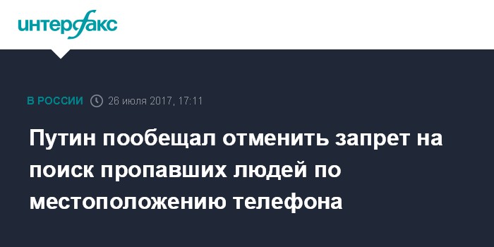 Москва. 26 июля. INTERFAX.RU - Президент РФ Владимир Путин пообещал проработать вопрос о снятии запрета на использование информации о местонахождении мобильных телефонов для поиска пропавших людей.