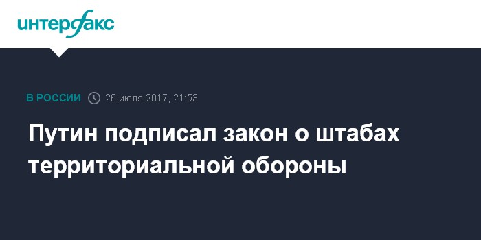 Москва. 26 июля. INTERFAX.RU - Президент РФ Владимир Путин подписал изменения в закон об обороне, по которым в субъектах РФ и муниципальных образованиях, на территориях которых введено военное положение, создаются межведомственные координирующие органы - штабы территориальной обороны.