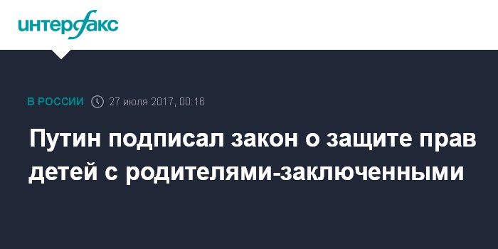 Москва. 27 июля. INTERFAX.RU - Президент России Владимир Путин подписал закон о внесении изменений в Уголовно-исполнительный кодекс РФ в целях защиты прав детей, родители которых отбывают наказание в виде лишения свободы, сообщается в среду на официальном сайте правовой информации.