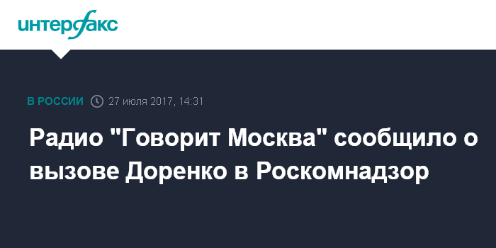 Москва. 27 июля. INTERFAX.RU - Главному редактору "Говорит Москва" Сергею Доренко предписано явиться в центральное управление Роскомнадзора, сообщает сайт радиостанции.