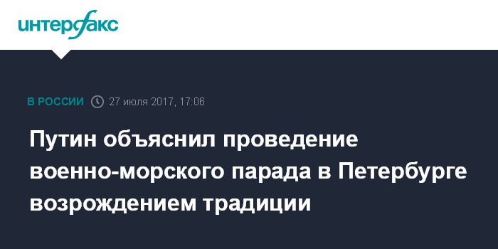 Москва. 27 июля. INTERFAX.RU - Президент России Владимир Путин заявил, что проведение военно-морского парада в Санкт-Петербурге является "не бряцанием оружием, а возрождением традиций".