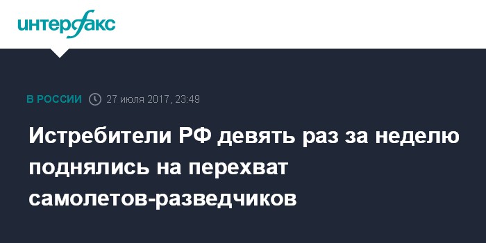 Москва. 27 июля. INTERFAX.RU - Российские истребители девять раз за прошедшую неделю вылетали на перехват разведывательных самолётов, сообщает центральный печатный орган Минобороны РФ газета "Красная звезда".