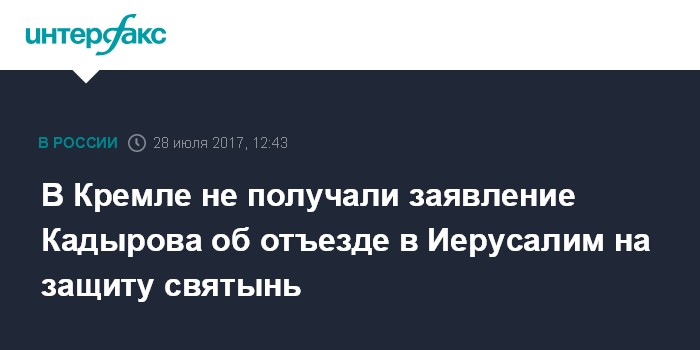 Москва. 28 июля. INTERFAX.RU - В Кремле заявили, что не получали заявления от главы Чечни Рамзана Кадырова о готовности оставить свой пост и заняться охраной мусульманской святыни Аль-Акса в Иерусалиме.