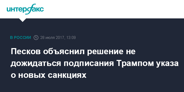 Москва. 28 июля. INTERFAX.RU - В Кремле заявили, что не стали дожидаться подписи президента США Дональда Трампа под законом об ужесточении санкций против РФ, поскольку после решения Сената технологически вопрос практически решен.