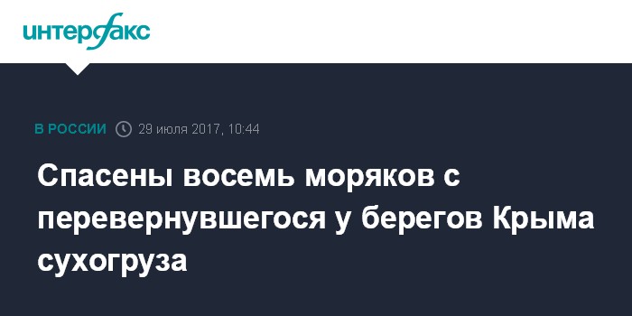 Москва. 29 июля. INTERFAX.RU - Восемь членов экипажа перевернувшегося у берегов Крымского полуострова сухогруза Anda спасены, судьба еще одного моряка пока неизвестна, сообщили "Интерфаксу" в субботу в Морском спасательно-координационном центре Севастополь.
