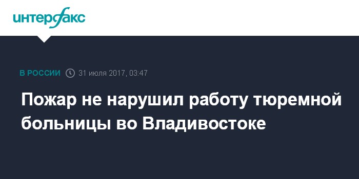 Москва. 31 июля. INTERFAX.RU - Пожар не нарушил работу краевой больницы Главного управления Федеральной службы исполнения наказания (ГУФСИН) во Владивостоке, где в воскресенье в дыму задохнулись четверо осужденных.