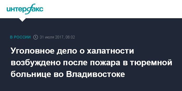 Москва. 31 июля. INTERFAX.RU - Гибель четверых осужденных во время пожара в краевой больнице Главного управления Федеральной службы исполнения наказания (ГУФСИН) во Владивостоке будет расследоваться в рамках уголовного дела.