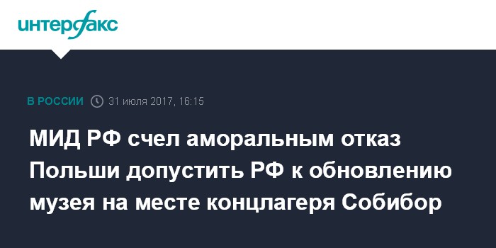 Москва. 31 июля. INTERFAX.RU - В Москве разочарованы поступившим из Варшавы отказом в присоединении России к международному проекту обновления Музея - Места Памяти "Собибор" на месте нацистского лагеря смерти, заявляют в МИД РФ.