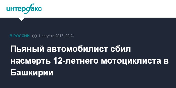 Москва. 1 августа. INTERFAX.RU - Пьяный водитель сбил двух подростков на мотоцикле в Учалинском районе Башкирии, один из них погиб, второй госпитализирован, сообщил начальник регионального управления ГИБДД Динар Гильмутдинов в своем блоге во вторник.
