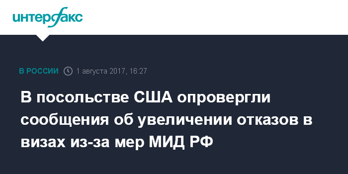 Москва. 1 августа. INTERFAX.RU - В посольстве США в Москве отвергли обвинения в том, что число отказов в выдаче виз выросло из-за осложнения отношений между странами.