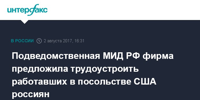 Москва. 2 августа. INTERFAX.RU - Фирма "Инпредкадры" - филиал Главного управления по обслуживанию дипломатического корпуса (ГлавУпДК), подведомственного МИД РФ, - готова зачислить в свою базу данных для дальнейшего трудоустройства работавших в посольстве США российских граждан, которые могут быть сокращены в связи с требованием Москвы.