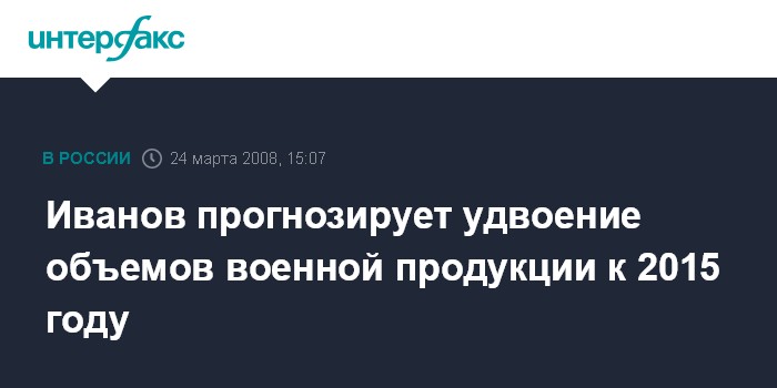 Как заявил сегодня на совещании у президента первый вице-премьер Сергей Иванов, "по этой стратегии к 2010 г. объем военной продукции данных предприятий должен увеличиться в 1,3 раза, а к 2015 г. - в 2,2 раза".