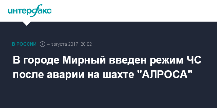 Москва. 4 августа. INTERFAX.RU - Глава МЧС России Владимир Пучков на оперативном совещании ввёл режим чрезвычайной ситуации в городе Мирный после аварии на руднике "Мир".