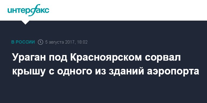 "Ураган, прошедший примерно в 15:30-16:00 местного времени под Красноярском сорвал кровлю со старого одноэтажного здания, принадлежащего аэропорту. Упавшая кровля повредила, в свою очередь, около десятка стоящих рядом автомобилей. Люди не пострадали", - сказала она.