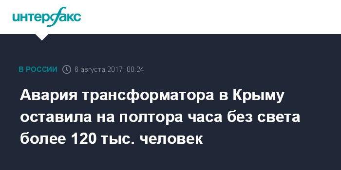 Москва. 6 августа. INTERFAX.RU - Более 120 тыс. человек в Крыму полтора часа оставались без электроснабжения в субботу вечером из-за повреждения трансформатора, говорится в сообщении на сайте Минэнерго РФ.