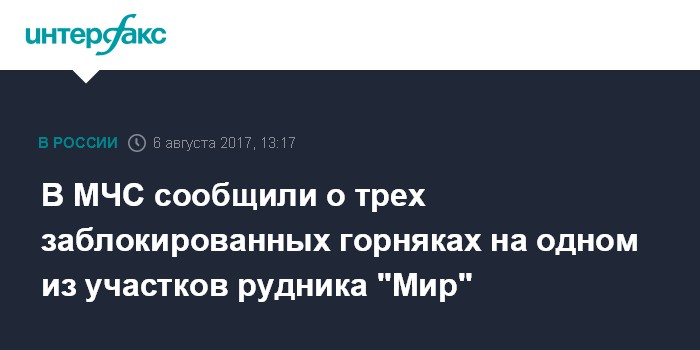 Москва. 6 августа. INTERFAX.RU - Трое шахтеров остаются заблокированными в районе "310 горизонта" на руднике "Мир" в Якутии, заявил замглавы МЧС Владлен Аксенов в эфире телеканала "Россия-24" (ВГТРК) в воскресенье.
