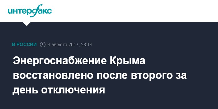 Москва. 6 августа. INTERFAX.RU - Потребителям Крыма вечером в воскресенье после часового отключения электроэнергии, вызванного превышением перетока мощности, восстановлено энергоснабжение, сообщается на сайте Минэнерго.