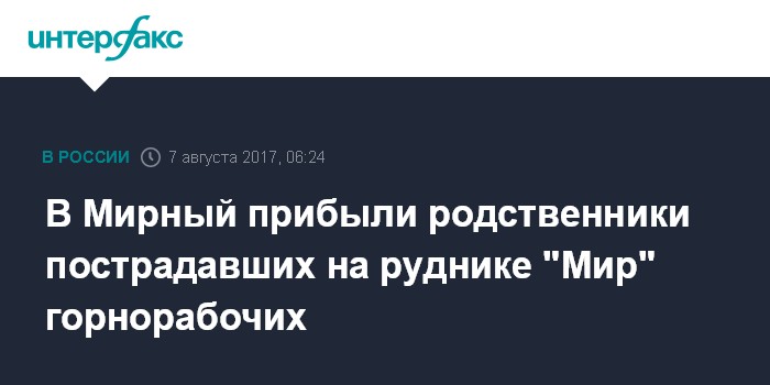 Москва. 7 августа. INTERFAX.RU - Родственники пострадавших на руднике "Мир" горнорабочих прибыли в город Мирный из подмосковного Домодедово, сообщили в пресс-службе МЧС России.