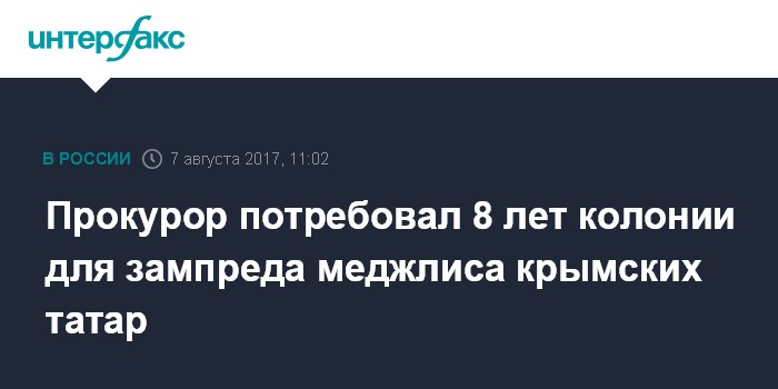 Москва. 7 августа. INTERFAX.RU - Гособвинитель попросил Верховный суд Крыма приговорить к восьми годам колонии заместителя председателя меджлиса крымских татар (организация запрещена в России) Ахтема Чийгоза, обвиняемого в организации массовых беспорядков на митинге 26 февраля 2014 года в Симферополе - в преддверии референдума о вхождении Крыма в состав РФ, сообщили "Интерфаксу" сторонники Чийгоза.