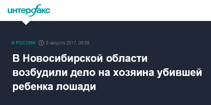Москва. 8 августа. INTERFAX.RU - В Новосибирской области расследуют уголовное дело в отношении хозяина лошади, которая смертельно травмировала 6-летнего мальчика в деревне Казанцево.
