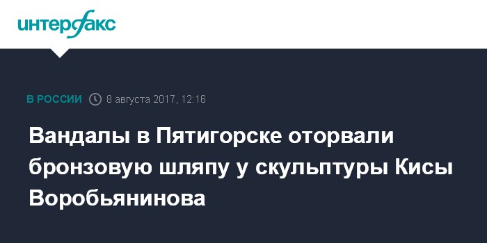 Москва. 8 августа. INTERFAX.RU - Неизвестные лишили бронзовой шляпы установленную в курортной зоне Пятигорска скульптуру Кисы Воробьянинова - персонажа произведения Ильфа и Петрова "Двенадцать стульев", сообщает пресс-служба администрации города.