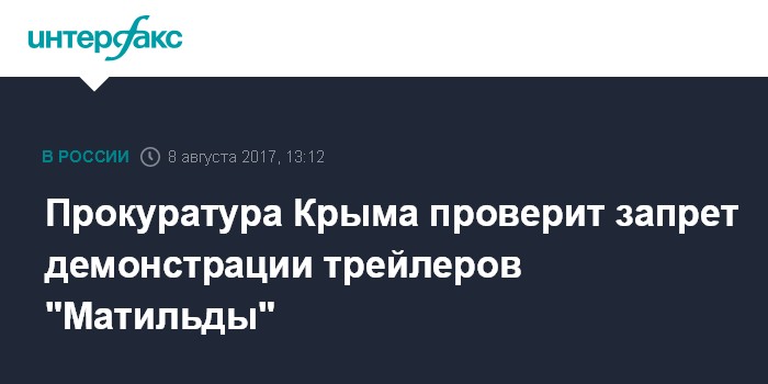 Москва. 8 августа. INTERFAX.RU - Прокуратура республики Крым организовала служебную проверку действий сотрудников надзорного ведомства Симферополя в связи с вынесением кинотеатрам города предостережения о недопустимости показа трейлера к фильму Алексея Учителя "Матильда".