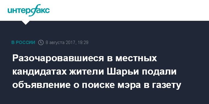 Москва. 8 августа. INTERFAX.RU - Группа активистов подала в газету объявление о поиске кандидата на должность главы города Шарья в Костромской области, передает корреспондент "Интерфакса".