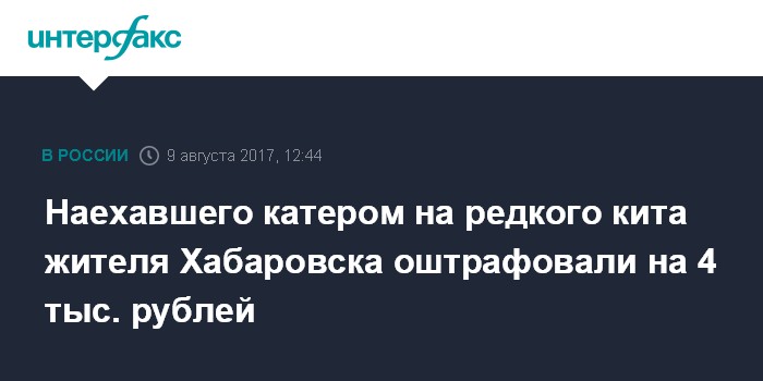 Москва. 9 августа. INTERFAX.RU - Судебный участок N70 Индустриального района Хабаровска вынес приговор по делу о наезде катера на краснокнижного гренландского кита в районе Шантарских островов.