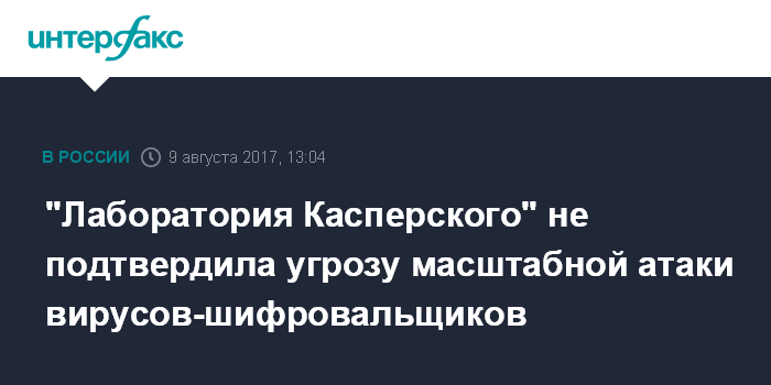 Москва. 9 августа. INTERFAX.RU - Эксперты "Лаборатории Касперского" не располагают данными о готовящейся масштабной кибератаке с использованием вирусов-шифровальщиков, сообщили "Интерфаксу" в среду в пресс-службе компании.