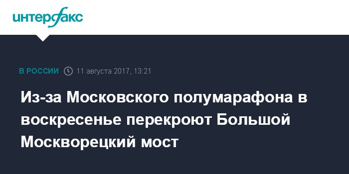 В сообщении уточняется, что 13 августа с 10:00 до 13:30 будет ограничено движение транспорта по улицам: Лужники, Болотная, Балчуг, Москворецкая, по Фалеевскому переулку, Большому Москворецкому мосту, Шлюзовому мосту, Лужнецкой, Фрунзенской, Пречистинской, Кремлевской, Софийской, Раушской, Космодамианской, Шлюзовой набережным.