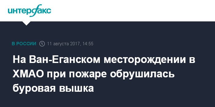 Москва. 11 августа. INTERFAX.RU - Буровая вышка обрушилась на Ван-Еганском месторождении в Нижневартовском районе Ханты-Мансийского автономного округа, тушение пожара продолжается, сообщил сайт Минэнерго РФ.