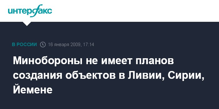 Москва. 16 января. INTERFAX.RU - Минобороны России опровергло сообщения некоторых СМИ о планах создания в Ливии, Сирии и Йемене пунктов базирования кораблей Военно-морского флота РФ.