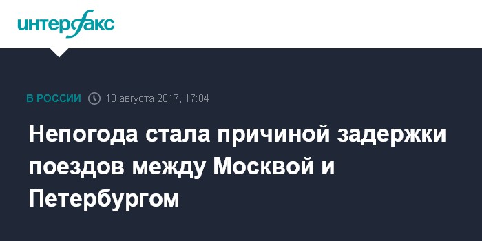 Москва. 13 августа. INTERFAX.RU - Непогода стала причиной задержки поездов, курсирующих между Москвой и Санкт-Петербургом, сообщил "Интерфаксу" представитель Октябрьской железной дороги (филиал ОАО "Российские железные дороги").
