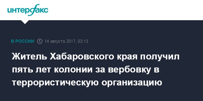 Москва. 14 августа. INTERFAX.RU - Дальневосточный окружной военный суд вынес приговор жителю Хабаровского края, вербовавшего россиян в террористическую организацию "Джебхат ан-Нусра" (деятельность организации запрещена на территории РФ - ИФ), сообщает пресс-служба Управления ФСБ России по Восточному военному округу.