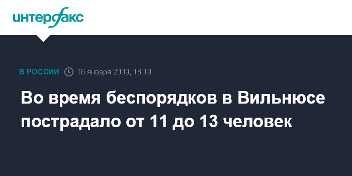 Вильнюс. 16 января. INTERFAX.RU - По различным данным, во время беспорядков в пятницу в Вильнюсе пострадали от 11 до 13 человек.