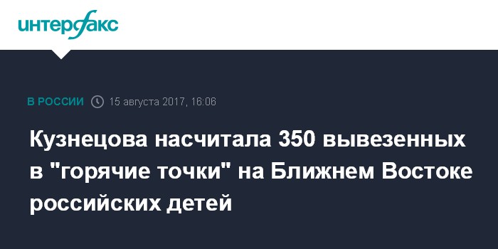 Москва. 15 августа. INTERFAX.RU - Уполномоченный при президенте РФ по правам ребенка Анна Кузнецова сообщила, что около 350 детей из России нелегально вывезены в "горячие точки" на Ближнем Востоке.