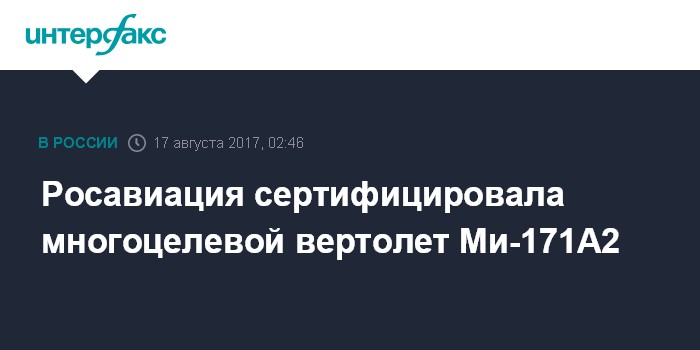 Москва. 17 августа. INTERFAX.RU - Росавиация выдала АО "Московский вертолетный завод им. М.Л. Миля" переизданный сертификат типа вертолета Ми-171А, в который включена новая модель этой машины - Ми-171А2.