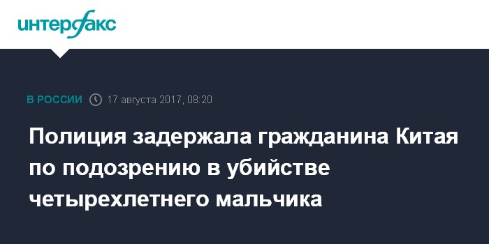 Москва. 17 августа. INTERFAX.RU - Пропавший несколько дней назад во Владивостоке четырехлетний мальчик найден убитым, по подозрению в совершении этого преступления задержан гражданин Китая, сообщил "Интерфаксу" информированный источник.