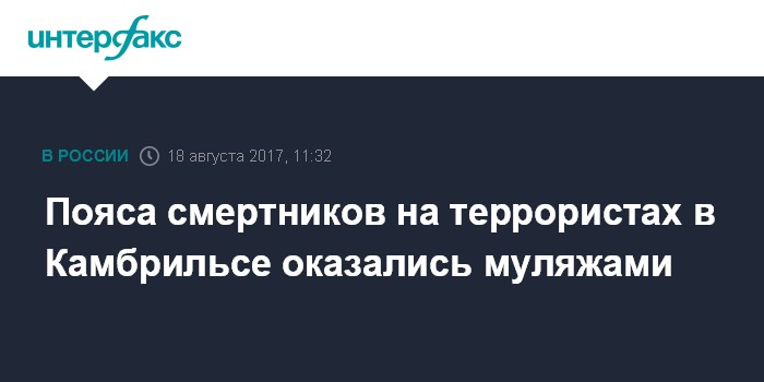 Москва. 18 августа. INTERFAX.RU - Глава Каталонии Карлес Пучдемон в эфире местной радиостанции сообщил, что пояса смертников, которые были на участниках нападения в городе Камбрильс, были ненастоящими.